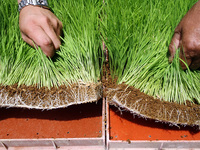 根がびっしり!イネの葉色もきれい!左がアミノeを使ったイネです